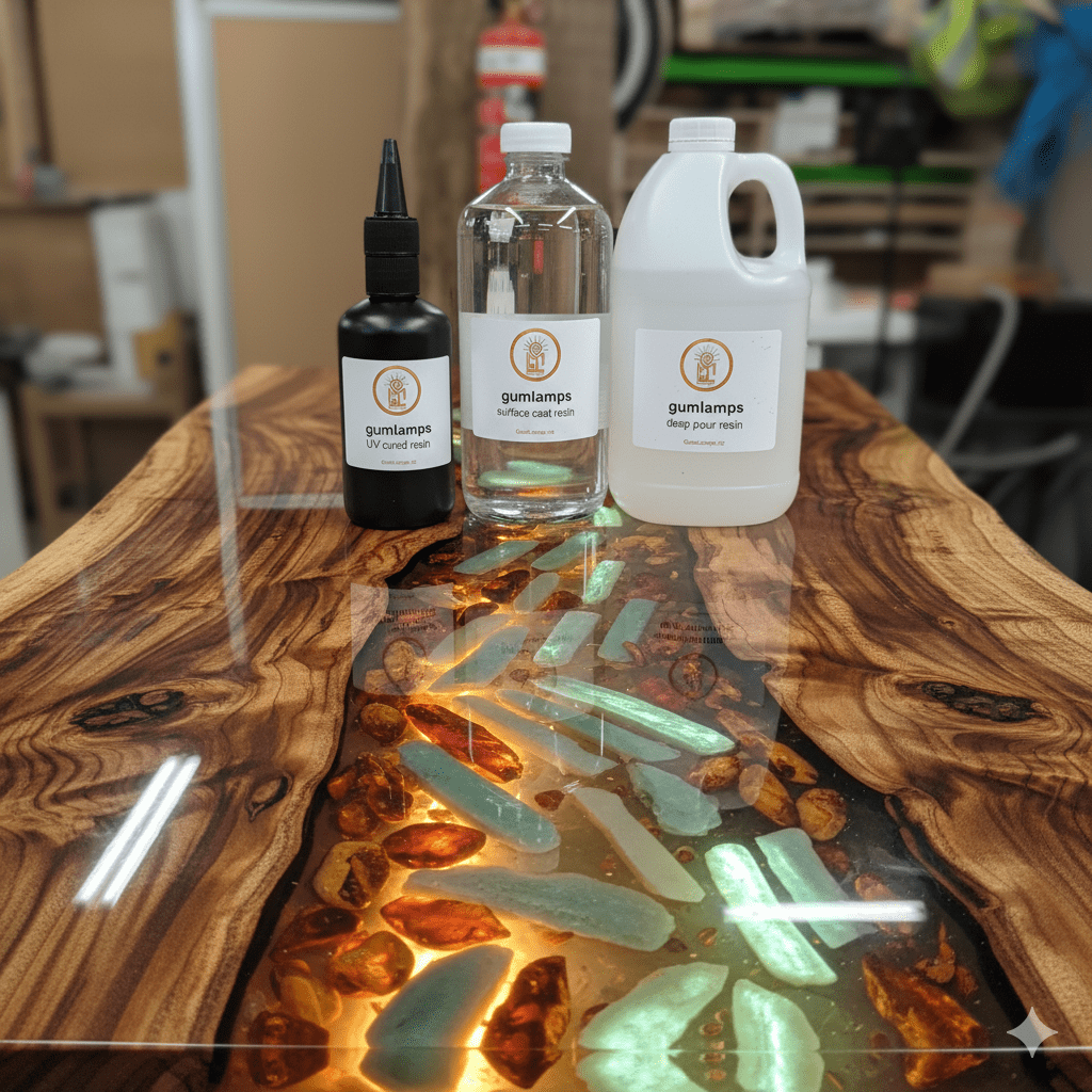 Customise your own LED river resin Kauri art with your personalised items or select from our options of local crystals and Kauri gum & glow stones.