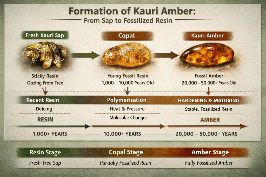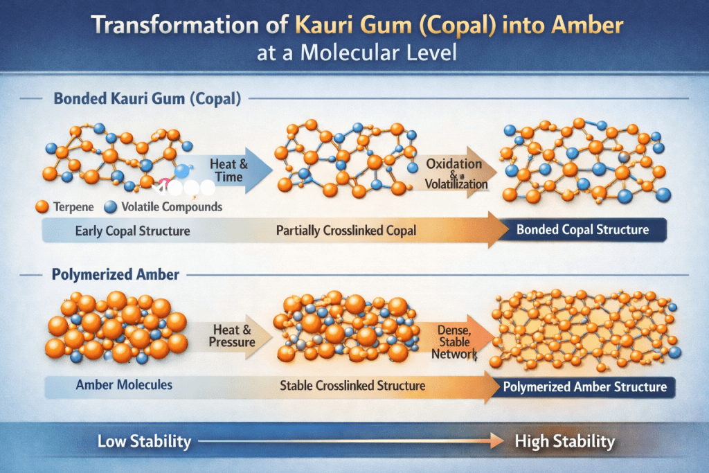 Polymerization is the process in which the resin molecules bond, turning kauri gum into a harder, more durable substance. Over time, this process makes the gum less brittle, darker, and more stable, eventually creating the transparent, amber-like resin known as copal or amber.
