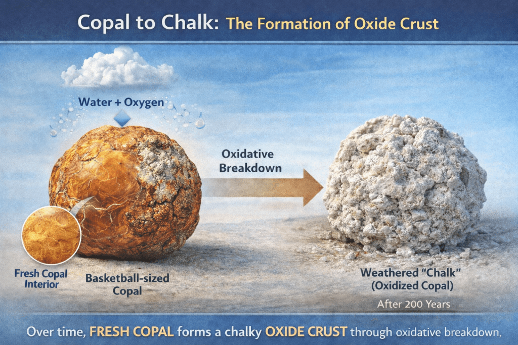 Copal oxidisation occurs when oxygen breaks down unstable resin compounds. Instead of simply hardening, advanced oxidation causes polymer chains to fracture, driving off volatiles and collapsing the structure. The surface and interior then lose cohesion, turning opaque, friable, and chalky rather than glassy. This “chalked” copal is chemically dead resin distinct from amberisation, which stabilises rather than degrades the