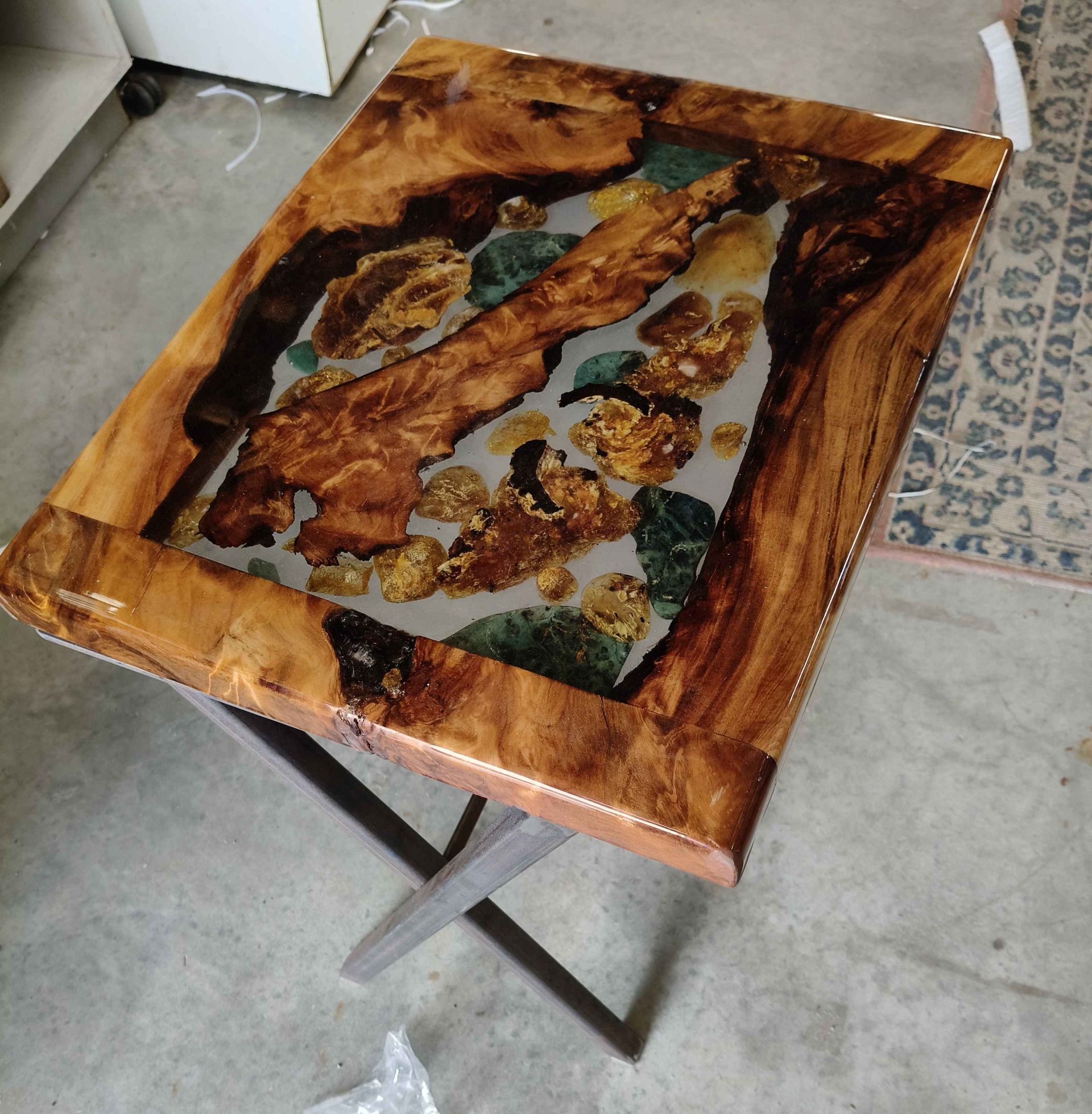 This ancient swamp kauri resin side table has the most stunning white bait chatoyant grain and contains approximately 1kg of kauri gum & greenstone ( tangiwai )